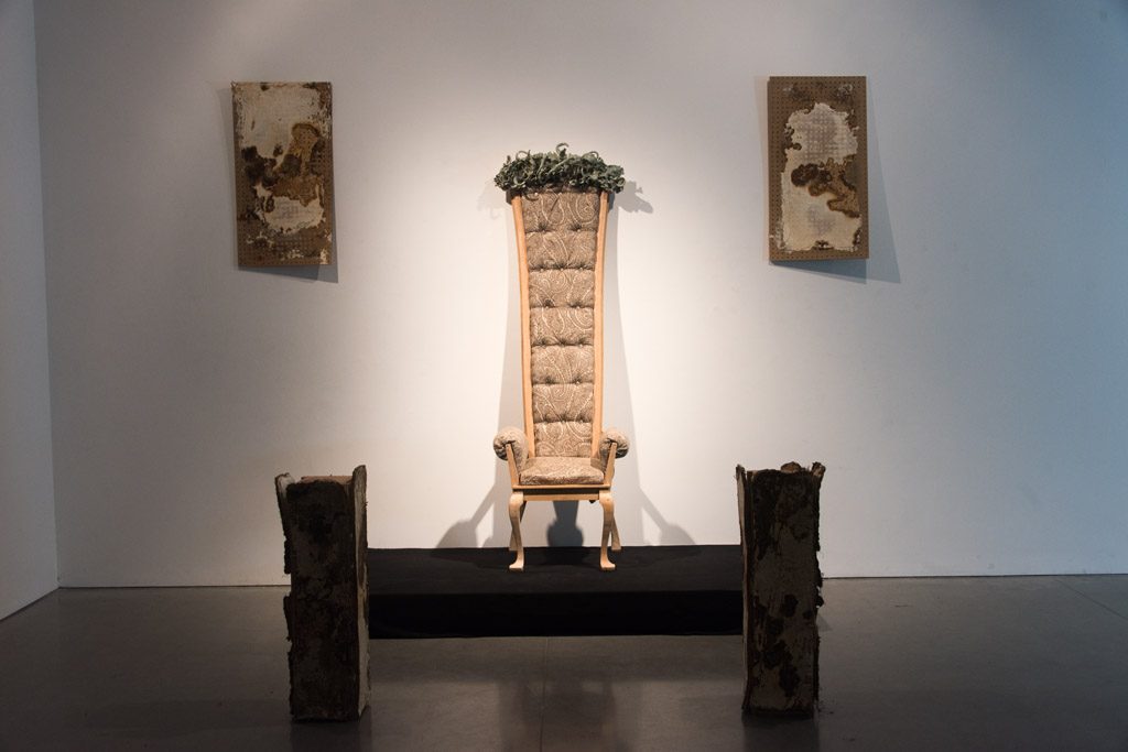 Lee Ann sits on the throne. She looks like a doll but has the aura of a goddess. She is indifferent to Michael and to the audience. She looks straight forward with a goddess like authority. She may look indifferently at the audience but knows she commands their desires. She may read a book or check her phone. If she does, she does with a doll like grace that she owns and she is indifferent to the fact that people look upon her.