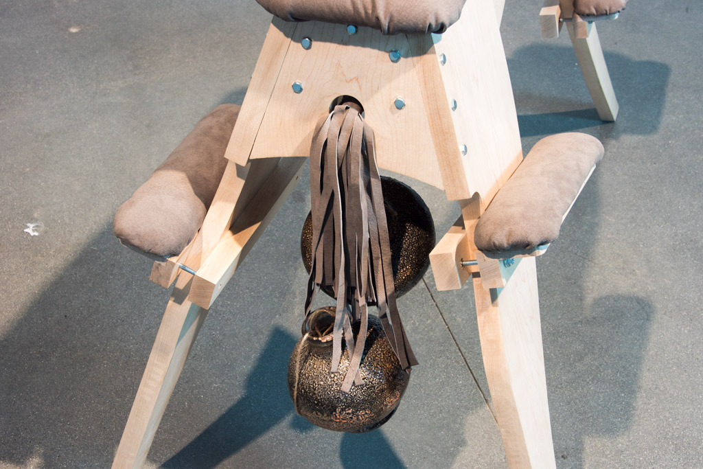 Michael is nude on the floor. The horse is on the floor dissambled. Michael enthusiastically assembles the horse that he built himself. He is infatuated with his own accomplishment but believes he is performing his task objectively. Periodically, he glances towards Lee Ann but pretends like he is indifferent to her. The penis pump is also on the floor. Michael completes the assembly of the horse. When the horse is assembled, he walks into Lee Ann’s space without looking at her and takes the two ceramic vases on the pedestals. He brings them back to the horse and ties them onto the hole in the back of the horse and inserts the flog. He straddles the horse acting like he is testing it out. He glances towards Lee Ann, expecting her to come over and give him a good spanking, however soon he becomes self conscious and supresses himself from acting overly desperate. After a minute of testing the horse out, he dismounts. He is embarassed and ashamed but tries to hide it. He slowly disassembles the horse with much less enthusiasm, neatly stacking the parts as if they are going right back to the storage. I walk into the space and gently tap Michael on the shoulder. Then I walk to the curtains and let the audience know the performance is over.