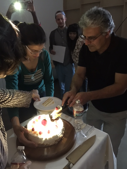 A cake with a picture of itself projected on it. Cake, Projection, exotic woods and expensive knives.